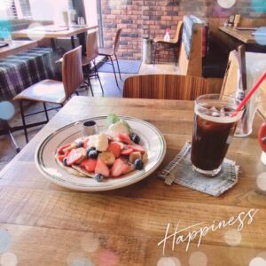 お昼にカフェでフルーツいっぱいのパンケーキ食べてきたよ〜?