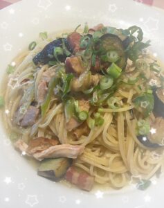 写真はおうちにあった有り合わせで作った割にはおいしくできたパスタだよー!?