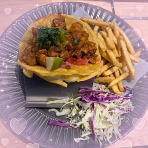 タコス〜?✨チーズがとろ〜り溶けてて、中のピリ辛なお肉とシャキシャキお野菜が最高にマッチしてたよ??