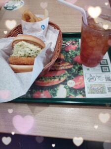 大好きなオニオンリングと一緒にバーガー食べれて幸せ?